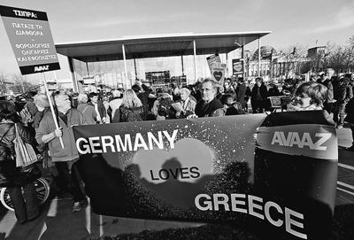 為彌合在希臘債務(wù)問題上的分歧,德國總理默克爾3月23日在柏林與到訪的希臘總理齊普拉斯會談。圖為當(dāng)天在德國柏林,有示威者打出“德國愛希臘”的標(biāo)語,呼吁雙方盡快達(dá)成共識。人民視覺
