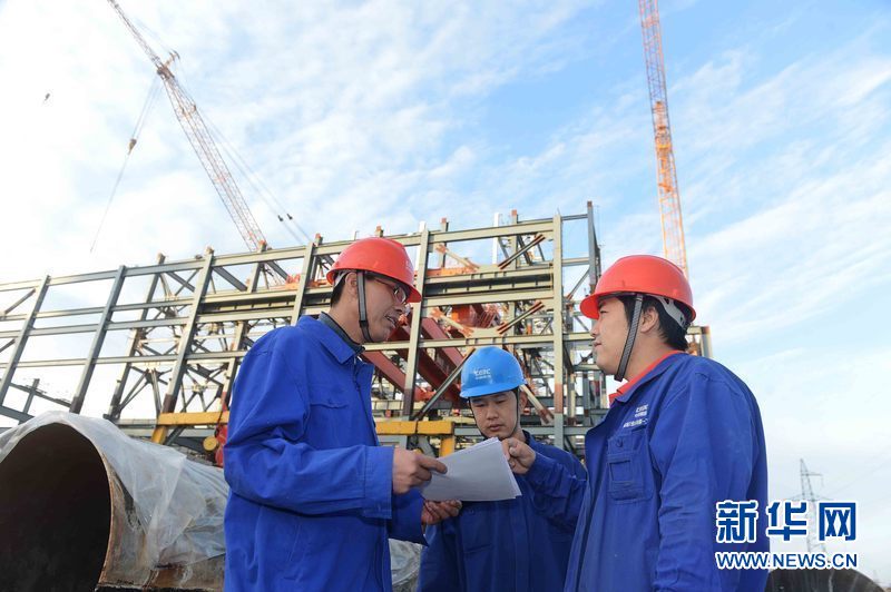 ????烏茲別克斯坦安格連(市)電廠主廠房鋼結(jié)構(gòu)施工,項目經(jīng)理兼項目黨支部書記楚相華(左)在與現(xiàn)場技術(shù)人員一起探討工程進度等情況。新華網(wǎng)發(fā) 記者沙達提 攝
