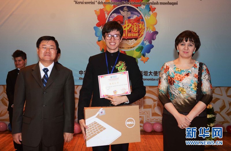 4月28日,在烏內(nèi)務部文化宮禮堂,來自撒馬爾罕國立外國語學院的扎爾卡毛(中文名:康曉鑫)獲得特等獎。新華網(wǎng)記者 沙達提攝