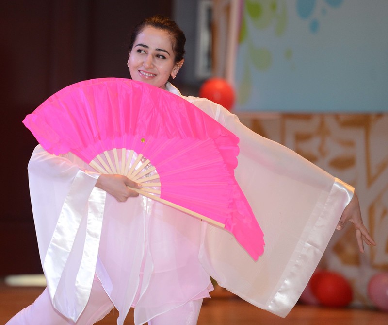 4月28日,在烏內(nèi)務部文化宮禮堂活動現(xiàn)場,撒馬爾罕外國語學院的UGILOY(中文名:雅靜)在參加比賽。新華網(wǎng)記者 沙達提攝