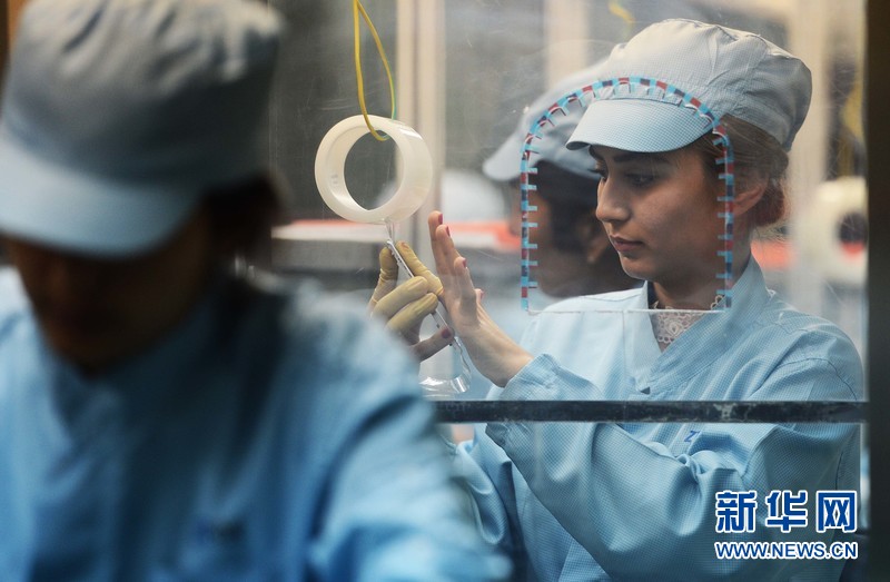 4月18日,在烏茲別克斯坦吉扎克工業(yè)特區(qū)錫爾河分區(qū)的鵬盛工業(yè)園區(qū),工人在鵬中興盛合資有限公司手機(jī)生產(chǎn)車間工作。新華社記者沙達(dá)提攝