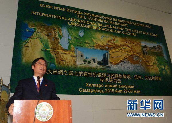 上海外國語大學黨委書記姜鋒說,“絲綢之路”是溝通東西方的商旅貿易之路,是開展交流的最好地方之一,撒馬爾罕更是歷史絲綢之路上的明珠,不同文明在此交融共生。同時也見證了人類對生命意義探索的歷史和文明交流成長。