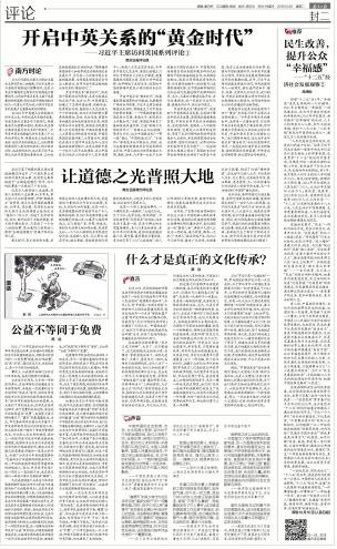 英國(guó)駐華大使吳百納連續(xù)用了四個(gè)“黃金”來形容習(xí)近平主席此次訪英的意義:“今年是中英關(guān)系的黃金年,這將是一次黃金訪問,它證明中英關(guān)系的發(fā)展處于黃金時(shí)期。訪問將確立中英面向21世紀(jì)的全球伙伴關(guān)系,開啟中英關(guān)系史上的黃金10年?!蔽覀兤诖⑾嘈?,這次為開啟中英關(guān)系“黃金時(shí)代”而往的里程碑式訪問,一定能成功打造中英關(guān)系新格局、繪制兩國(guó)關(guān)系新藍(lán)圖、開辟務(wù)實(shí)合作新前景、樹立國(guó)際合作新典范。(南方日?qǐng)?bào)評(píng)論員)