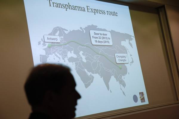 ↑港務局、碼頭運營商、船運企業(yè)、貨主等各方人士聆聽安特衛(wèi)普港與中國“一帶一路”對接的介紹。