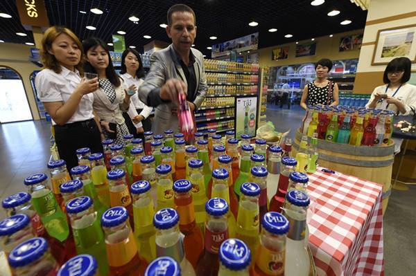 2015年6月8日,中東歐國(guó)家特色商品館在浙江寧波開(kāi)館。圖為一位塞爾維亞商人在寧波中東歐國(guó)家特色商品館向參觀者展示商品。(新華社記者鞠煥宗攝)
