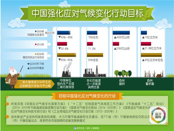 今年6月,中國(guó)正式向聯(lián)合國(guó)提交2020年后應(yīng)對(duì)氣候變化的“國(guó)家自主決定貢獻(xiàn)”:二氧化碳排放2030年左右達(dá)到峰值并爭(zhēng)取盡早實(shí)現(xiàn),單位國(guó)內(nèi)生產(chǎn)總值二氧化碳排放比2005年下降60%至65%,非化石能源占一次能源消費(fèi)比重達(dá)到20%左右,森林蓄積量比2005年增加45億立方米左右。
