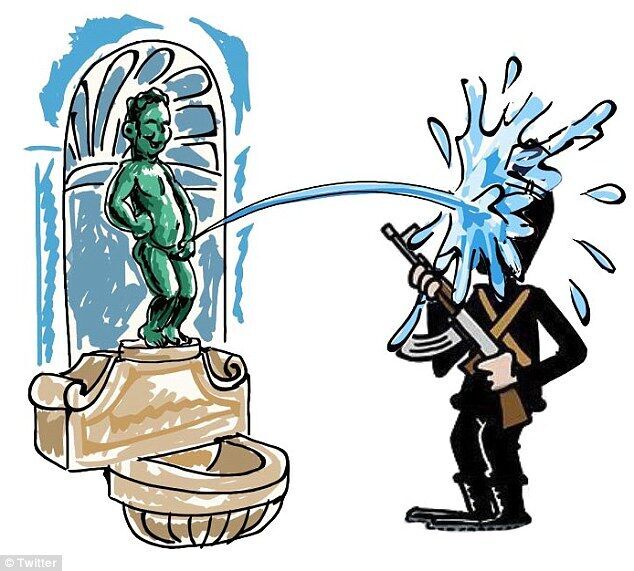 漫畫(huà)中,可愛(ài)的“撒尿小童”向代表恐怖主義的槍械和持槍者暢快地撒尿。也有網(wǎng)友將法國(guó)和比利時(shí)的國(guó)旗拼湊在一起,表達(dá)了同為恐襲受害國(guó)的法國(guó)與比利時(shí)站在一起,共同面對(duì)恐怖組織。