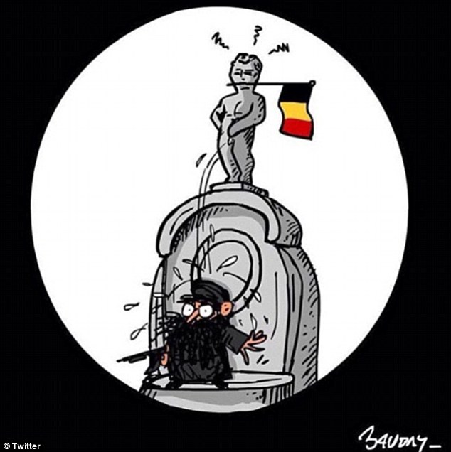 眾所周知,“撒尿小童”(Manneken Pis)是布魯塞爾廣場的標(biāo)志性建筑,也是游客必游的景點。有網(wǎng)友就借此制作漫畫,展示對恐怖主義的藐視。
