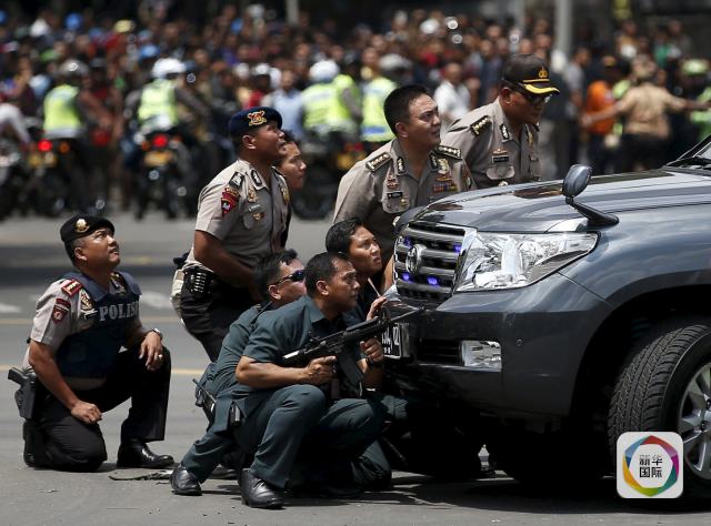 1月14日,在印度尼西亞首都雅加達,警察持槍隱蔽在一輛汽車后。雅加達市中心14日上午發(fā)生多起爆炸,警方同武裝分子發(fā)生交火。新華社/路透
