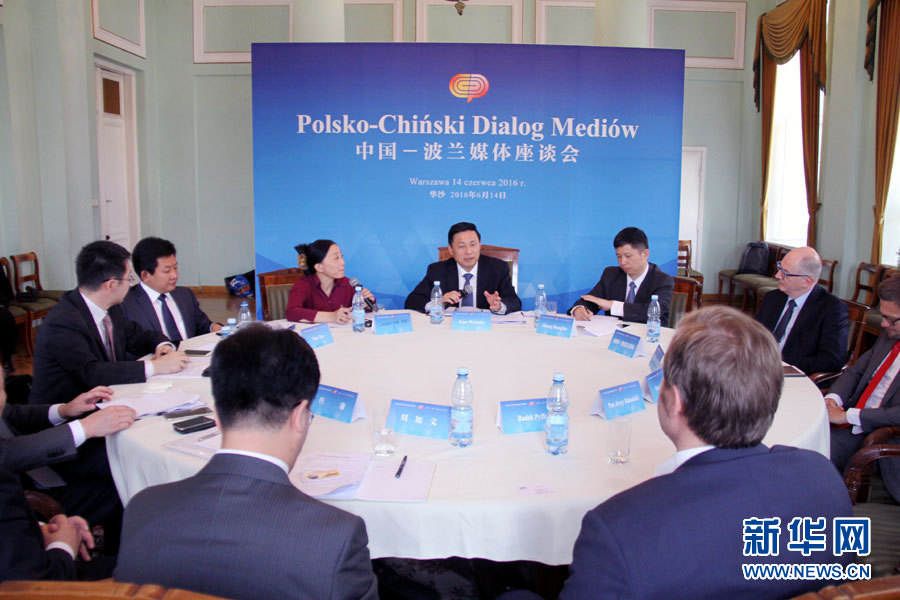 ??? 6月14日,參加中國—波蘭媒體座談會的中波媒體代表正在熱烈交流討論。當天,由中國國務院新聞辦公室主辦的中國—波蘭媒體座談會在波蘭首都華沙召開,包括新華社、中央電視臺、中國國際廣播電臺、中國日報社、新華網、波蘭通訊社、波蘭國家電視臺、波蘭《共和國報》、波蘭廣播電臺和波蘭亞洲研究中心等中波媒體代表參加了此次座談會,雙方代表就中波兩國媒體合作和“一帶一路”建設等議題進行了熱烈的交流和討論。新華網記者 陳序 攝