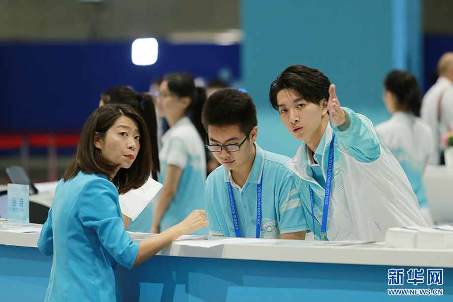 ????“小青荷”是此次峰會志愿者的代名詞。這個名字取自宋代詩人楊萬里描寫杭州的詩句“接天蓮葉無窮碧,映日荷花別樣紅”,“青荷”也音同“親和”,他們成了G20杭州峰會新聞中心里一道亮麗的風景。新華網(wǎng) 祝立銘 攝