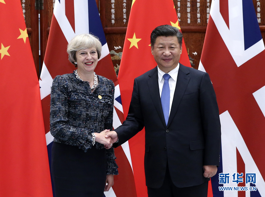 9月5日,國家主席習(xí)近平在杭州會(huì)見來華出席二十國集團(tuán)領(lǐng)導(dǎo)人峰會(huì)的英國首相特雷莎·梅。 新華社記者龐興雷攝