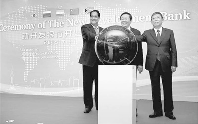 2015年7月21日,新開發(fā)銀行開業(yè)儀式在上海舉行。財(cái)政部部長樓繼偉(中)與上海市市長楊雄(右)、金磚國家新開發(fā)銀行行長卡馬特共同啟動(dòng)新開發(fā)銀行。 資料圖片