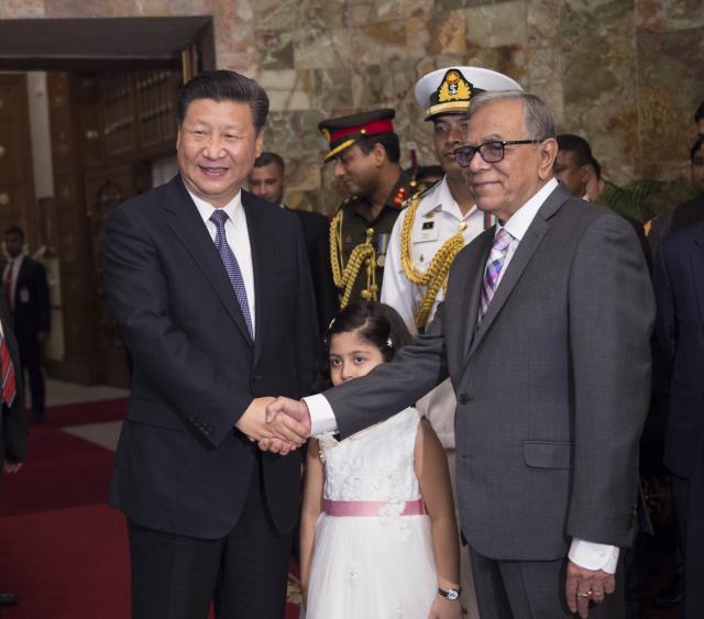 【中孟兩國友誼代代相傳再寫佳話】14日中午,習(xí)近平主席抵達(dá)孟加拉國首都達(dá)卡,在機(jī)場受到熱烈歡迎。哈米德總統(tǒng)親自到機(jī)場迎接,并帶來自己的小孫女向習(xí)主席獻(xiàn)上鮮花。無獨有偶,1956年,周恩來總理訪問孟加拉國時,孟加拉國國父拉赫曼帶著女兒向周總理獻(xiàn)花。當(dāng)年那位獻(xiàn)花的小姑娘正是現(xiàn)在的孟加拉國總理哈西娜。習(xí)主席深情地對孟加拉國領(lǐng)導(dǎo)人說:“這是中孟兩國友誼代代相傳的佳話。”
