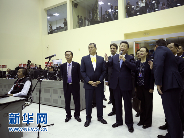 習(xí)近平抵達(dá)公共安全應(yīng)急指揮中心時(shí),科雷亞在門(mén)口迎接。兩國(guó)元首共同參觀中方支援厄瓜多爾抗震救災(zāi)圖片展,并為厄瓜多爾公共安全應(yīng)急指揮中心聯(lián)合實(shí)驗(yàn)室揭牌。兩國(guó)元首觀看介紹喬內(nèi)醫(yī)院和辛克雷水電站的視頻,并同項(xiàng)目現(xiàn)場(chǎng)人員連線(xiàn)互動(dòng)。喬內(nèi)醫(yī)院現(xiàn)場(chǎng)中方負(fù)責(zé)人向兩國(guó)元首報(bào)告醫(yī)院工程正式開(kāi)工。在辛克雷水電站,專(zhuān)程前往現(xiàn)場(chǎng)的厄瓜多爾副總統(tǒng)格拉斯介紹項(xiàng)目完成情況。兩國(guó)元首共同按動(dòng)按鈕,辛克雷水電站正式竣工發(fā)電。