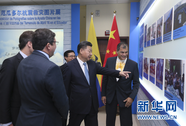 當(dāng)?shù)貢r(shí)間11月18日,國(guó)家主席習(xí)近平在基多同厄瓜多爾總統(tǒng)科雷亞共同出席中方援建的厄瓜多爾公共安全應(yīng)急指揮中心聯(lián)合實(shí)驗(yàn)室揭牌儀式,喬內(nèi)醫(yī)院奠基、科卡科多-辛克雷水電站竣工發(fā)電視頻連線(xiàn)活動(dòng)。這是兩國(guó)元首共同參觀中方支援厄瓜多爾抗震救災(zāi)圖片展。新華社記者 蘭紅光 攝
