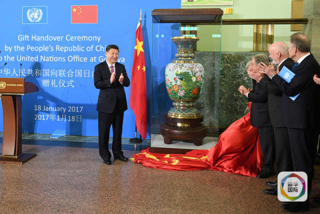 1月18日,國家主席習(xí)近平在瑞士日內(nèi)瓦萬國宮出席“共商共筑人類命運(yùn)共同體”高級別會議,并發(fā)表題為《共同構(gòu)建人類命運(yùn)共同體》的主旨演講。這是會議結(jié)束后,習(xí)近平出席中國向聯(lián)合國日內(nèi)瓦總部贈禮儀式。(新華社記者張鐸攝)