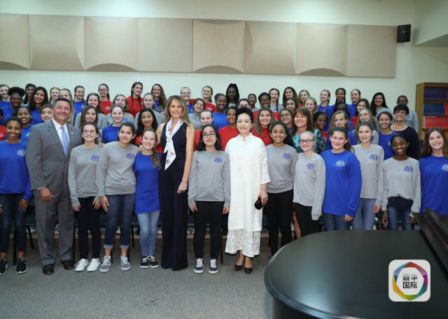 當(dāng)?shù)貢r(shí)間4月7日上午,應(yīng)美國(guó)總統(tǒng)夫人梅拉尼婭邀請(qǐng),國(guó)家主席習(xí)近平夫人彭麗媛參觀位于佛羅里達(dá)州西棕櫚灘市的巴克藝術(shù)中學(xué)。這是彭麗媛同梅拉尼婭在參觀聲樂(lè)教室后與學(xué)生們合影。(新華社記者丁林?jǐn)z)