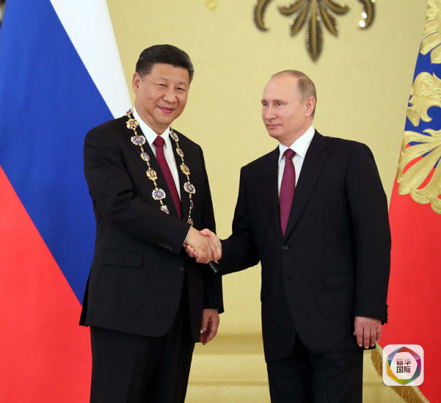 7月4日,國家主席習(xí)近平在莫斯科克里姆林宮同俄羅斯總統(tǒng)普京舉行會(huì)談。這是會(huì)談后,普京向習(xí)近平授予俄羅斯國家最高勛章“圣安德烈”勛章。新華社記者 劉衛(wèi)兵 攝