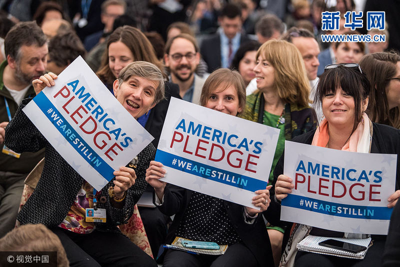當(dāng)?shù)貢r(shí)間2017年11月11日,德國(guó)波恩,波恩氣候大會(huì)召開(kāi),“美國(guó)會(huì)館”內(nèi)景。雖然美國(guó)宣布退出了《巴黎協(xié)定》,但美國(guó)氣候談判代表仍出席了波恩的會(huì)議。美國(guó)除聯(lián)邦外的各級(jí)政府均派代表參加波恩會(huì)議,且主要目的就是表明他們?nèi)詫⒅铝τ趦冬F(xiàn)美國(guó)在巴黎做出的承諾。在美國(guó)國(guó)內(nèi),成千上萬(wàn)的市長(zhǎng)、州長(zhǎng)、部落首領(lǐng)、企業(yè)高管以及普通美國(guó)人都在努力降低溫室氣體排放。這個(gè)名為“我們?nèi)栽趫?jiān)守(We Are Still In)”的聯(lián)盟的成員代表了美國(guó)一半以上的人口以及54%的經(jīng)濟(jì)產(chǎn)出?!拔覀?nèi)栽趫?jiān)守”( We Are Still In)、“美國(guó)氣候聯(lián)盟”、“氣候市長(zhǎng)”(Climate Mayors)和其它諸多計(jì)劃向全世界傳遞了這樣一個(gè)信息,即美國(guó)仍然有很多人正致力于擁有宏偉目標(biāo)的氣候行動(dòng)之中,而“美國(guó)的承諾”(America’s Pledge)正在尋求如何量化并傳播這些承諾。(圖片來(lái)源:視覺(jué)中國(guó))