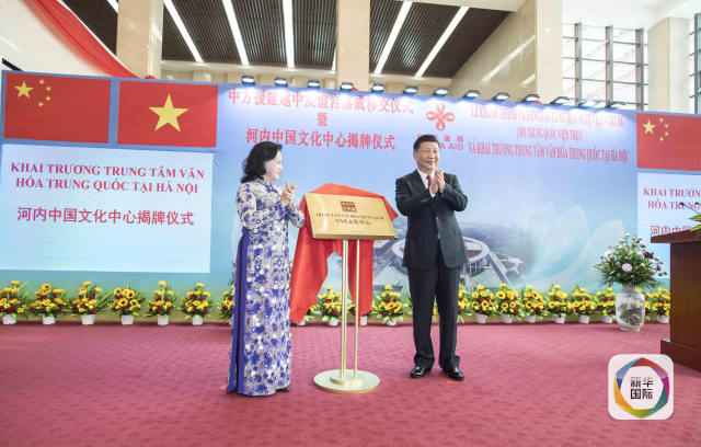 11月12日,中共中央總書記、國家主席習(xí)近平在河內(nèi)出席越中友誼宮落成移交儀式暨河內(nèi)中國文化中心揭牌儀式。這是習(xí)近平和越南國會主席阮氏金銀共同為中國文化中心揭牌。新華社記者李濤攝