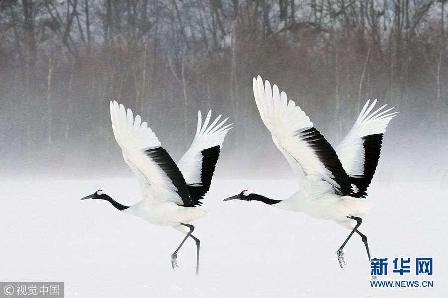 日本一對(duì)丹頂鶴冰面上“共舞” 似孿生芭蕾舞演員