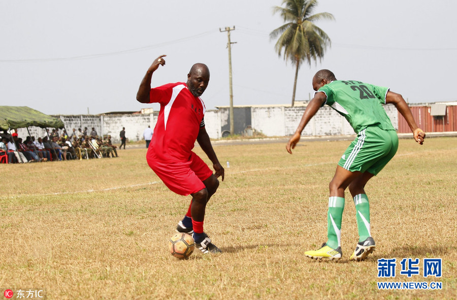 1月20日,利比里亞首都蒙羅維亞,利比里亞當(dāng)選總統(tǒng)、前世界足球先生喬治-維阿參加慈善足球比賽,率領(lǐng)維阿全明星隊(duì)對(duì)戰(zhàn)利比里亞武裝部隊(duì)士兵隊(duì)。喬治-維阿在去年12月27日當(dāng)選利比里亞新一任總統(tǒng),并將于2018年1月22日就職。(圖片來(lái)源:東方IC)