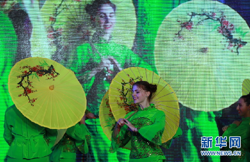 ?。痹拢玻橙?,烏克蘭基輔第一東方語言學(xué)校的學(xué)生表演傘舞。新華網(wǎng)發(fā)(陳俊鋒攝)
