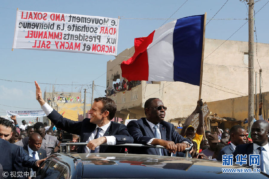 當(dāng)?shù)貢r(shí)間2月3日,塞內(nèi)加爾圣路易,塞內(nèi)加爾總統(tǒng)馬基·薩勒陪到訪的法國(guó)總統(tǒng)馬克龍?jiān)煸L當(dāng)?shù)?,兩人乘車向民眾致意。(圖片來源:視覺中國(guó))