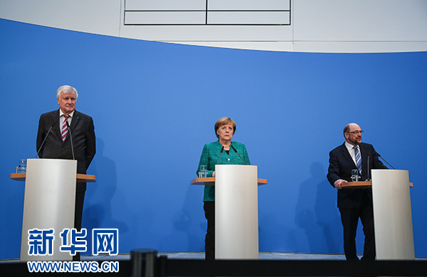 2月7日,在德國柏林的基民盟總部,德國總理、聯(lián)盟黨領(lǐng)導(dǎo)人默克爾(中),社會民主黨主席舒爾茨(右)和基社盟主席澤霍費(fèi)爾出席新聞發(fā)布會。新華社記者 單宇琦 攝