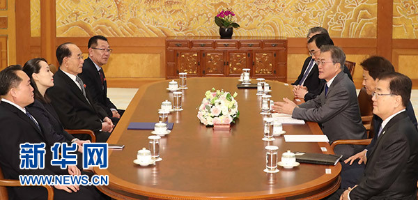 2月10日,在韓國首爾青瓦臺,韓國總統(tǒng)文在寅(右三)會見由朝鮮最高人民會議常任委員會委員長金永南(左三)率領(lǐng)的朝鮮高級別代表團。新華社/紐西斯通訊社