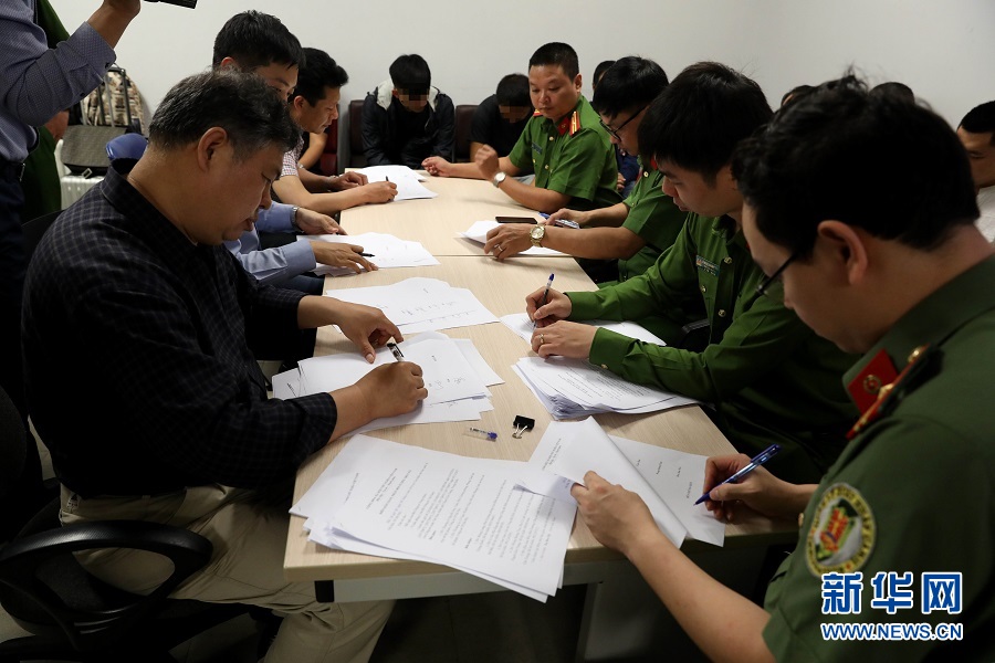 4月28日,中越警方簽署移交相關(guān)文件。當(dāng)日,越南警方在河內(nèi)內(nèi)排國際機場向中國警方工作組移交了許某等8名涉嫌詐騙罪的在逃嫌疑人。中國警方“獵狐行動”在越南再獲新成果。新華社記者王迪攝