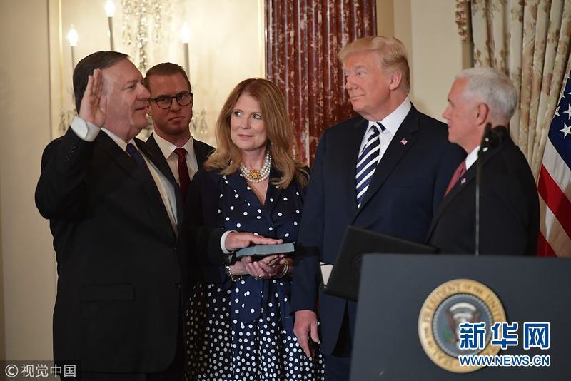 資料圖:5月2日,美國(guó)華盛頓,邁克·蓬佩奧在總統(tǒng)特朗普的見(jiàn)證下正式宣誓就職美國(guó)國(guó)務(wù)卿。新華網(wǎng)發(fā)