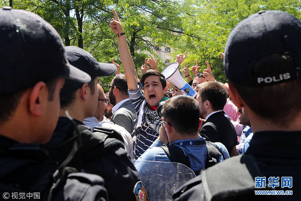 5月15日,土耳其安卡拉,示威者在以色列領(lǐng)事館附近投擲雞蛋和石塊,抗議美國(guó)駐以色列使館遷至耶路撒冷。(圖片來源:視覺中國(guó))