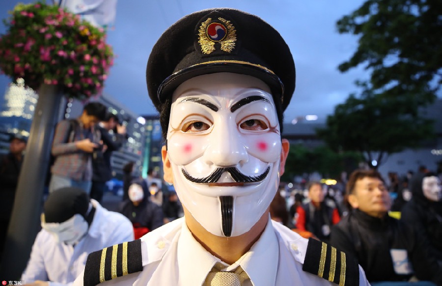 當(dāng)?shù)貢r(shí)間2018年5月18日,韓國(guó)首爾,大韓航空有限公司的飛行員戴著蓋伊·??怂姑婢撸谑谞柺袇^(qū)集會(huì)抗議,反對(duì)大韓航空會(huì)長(zhǎng)兼首席執(zhí)行官趙亮鎬及其家庭。
