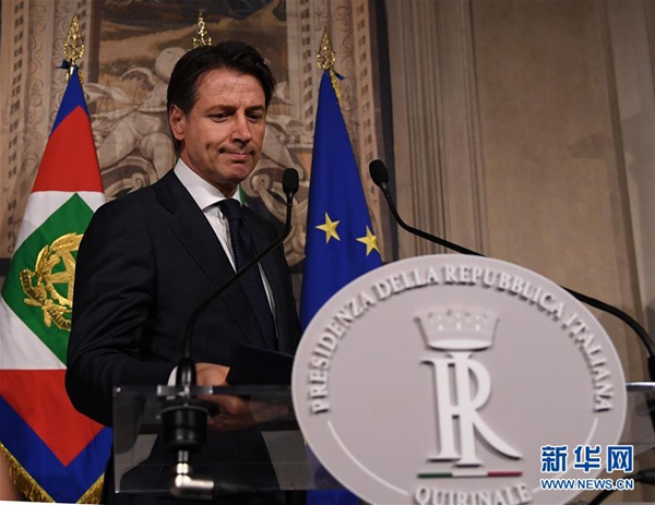 5月27日,在意大利首都羅馬,意新任總理孔特發(fā)表講話。據(jù)當(dāng)?shù)孛襟w報(bào)道,孔特27日晚間與總統(tǒng)馬塔雷拉會面并提交擬定的內(nèi)閣成員名單時,馬塔雷拉否決了由意大利聯(lián)盟黨和五星運(yùn)動力推的持疑歐立場的經(jīng)濟(jì)學(xué)家保羅·薩沃納出任財(cái)政部長。孔特向總統(tǒng)提出放棄組閣任務(wù)請求,請求得到總統(tǒng)確認(rèn)。新華社發(fā)(阿爾貝托·林格里亞攝)