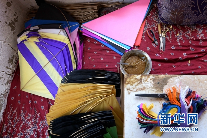這是5月29日在阿富汗喀布爾拍攝的希杰蘭扎風(fēng)箏用的剪刀、漿糊和紙張等材料。新華社記者 代賀 攝