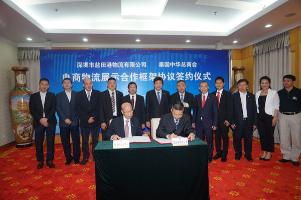 泰國中華總商會(huì)主席陳振治一行與深圳市鹽田港物流有限公司簽署電商物流展示合作框架協(xié)議。圖中前排為陳振治(左)和劉南安(右)。主辦方供圖。