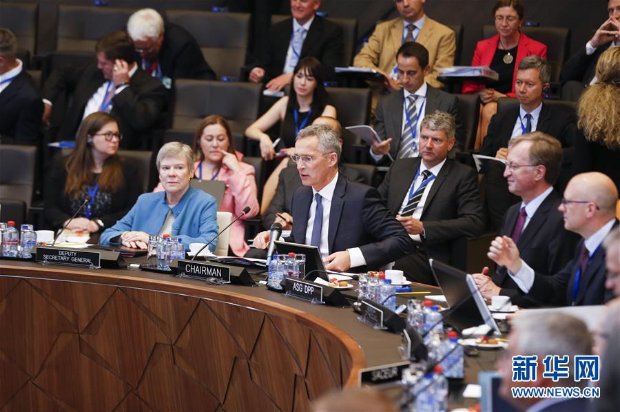 6月7日,在位于比利時布魯塞爾的北約總部,北約秘書長斯托爾滕貝格(中)主持北約防長會。新華社記者葉平凡 攝
