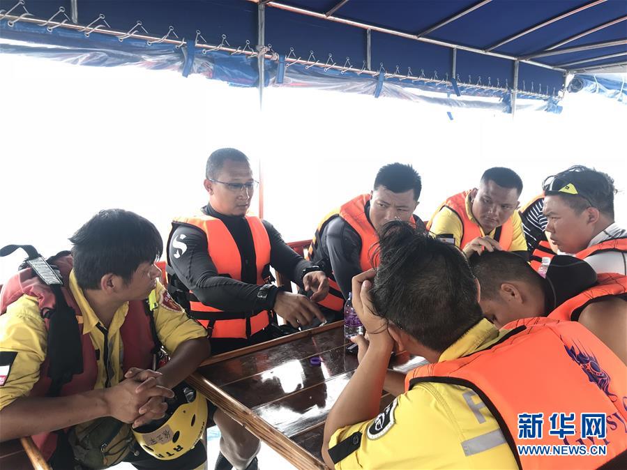 7月8日,在泰國(guó)普吉,來(lái)自民間的公羊救援隊(duì)與普吉藍(lán)海救援隊(duì)成員制定救援方案。