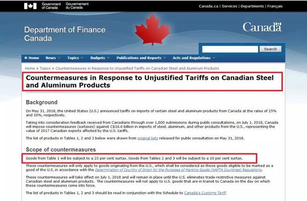 加拿大財(cái)政部官網(wǎng)發(fā)布的公告,標(biāo)題可以說(shuō)是相當(dāng)?shù)刂笔阈匾芰耍骸秾?duì)加拿大鋼鋁產(chǎn)品受到不公平關(guān)稅待遇的反擊措施》(Countermeasures in Response to Unjustified Tariffs on Canadian Steel and Aluminum Products)。抱怨三連:countermeasures(對(duì)抗措施), in Response to(對(duì)……做出反應(yīng)),unjustified(不公平的)——看得出,加拿大是真生氣了。
