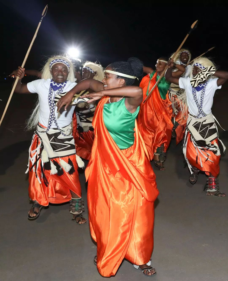 盛裝禮兵英姿挺拔,向尊貴的客人行注目禮。鼓聲響起,盧旺達民眾身著靚麗民族服裝,跳起熱情的迎賓舞,時而舒展柔緩,時而剛健有力。兩國元首駐足觀看,揮手致意。