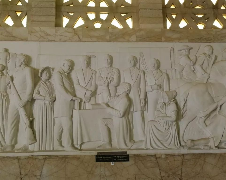 在紀(jì)念館大堂里的巨大拱形窗下,27幅浮雕詳細講述了當(dāng)年(1835-1852)荷裔布爾人大遷徙的歷史。每幅浮雕下面,都有一個二維碼。