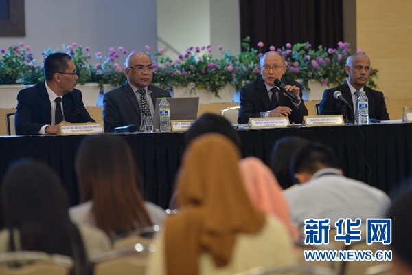 7月30日,馬航370航班客機(jī)安全調(diào)查組負(fù)責(zé)人郭師傳(右二)在馬來西亞普特拉賈亞舉行的新聞發(fā)布會上講話。 新華社發(fā)(張紋綜攝)