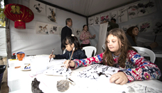 圍繞著中央舞臺(tái),剪紙、書(shū)法、針灸等展位前人頭攢動(dòng),吸引了許多聞?dòng)嵍鴣?lái)的華僑華人和當(dāng)?shù)孛癖?。巴西瓦加斯基金?huì)華人教授夏華聲帶著兩個(gè)兒子前來(lái)參加活動(dòng)。