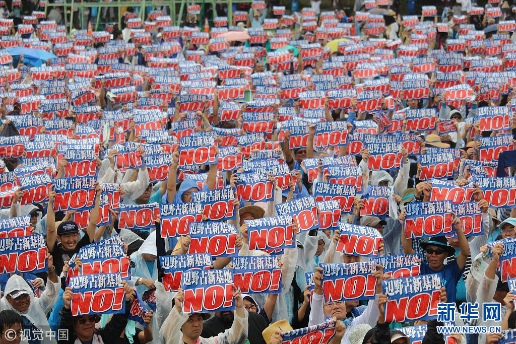 當?shù)貢r間2018年8月11日,日本沖繩縣約7萬民眾8月11日在那霸市舉行大規(guī)模集會,反對駐日美軍將普天間基地遷往名護市邊野古地區(qū),要求駐日美軍放棄在邊野古地區(qū)新建基地并立即關(guān)閉普天間機場。當天,日本東京都、大阪府、福岡、北海道縣等地民眾也同時舉行集會和游行,抗議日本政府推進邊野古地區(qū)填海施工。(圖片來源:視覺中國)