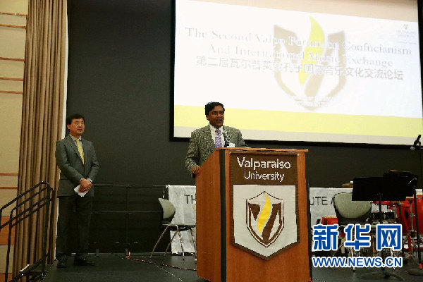 9月17日,美國瓦爾普萊索大學副校長賈伊尚卡爾·拉曼在第二屆孔子國際音樂文化交流論壇開幕式上致辭。新華社記者汪平 攝