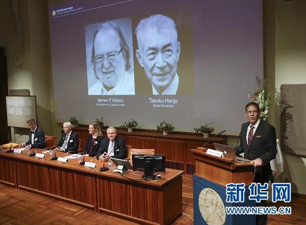 10月1日,在瑞典斯德哥爾摩卡羅琳醫(yī)學院舉行的新聞發(fā)布會現(xiàn)場,大屏幕顯示美國科學家詹姆斯·艾利森(左)和日本科學家本庶佑的照片。 新華社記者葉平凡攝