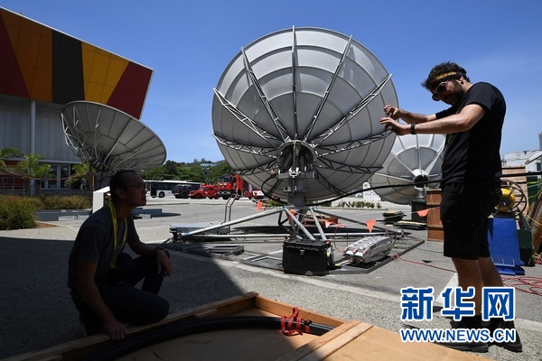 11月13日,工作人員在巴布亞新幾內(nèi)亞首都莫爾茲比港的APEC國際媒體中心安裝衛(wèi)星設備。 新華社記者呂小煒攝