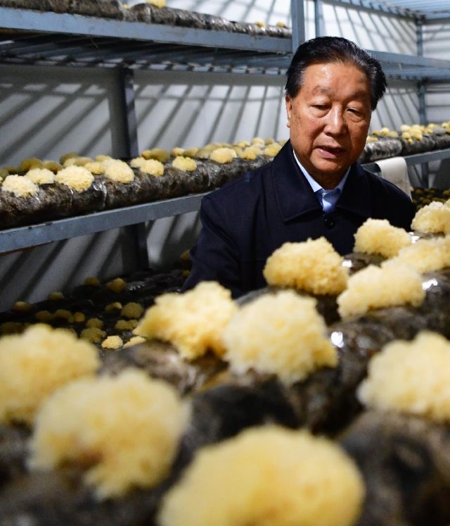 福建農(nóng)林大學研究員林占熺在查看利用巨菌草碎渣來培育的銀耳。新華社記者 魏培全 攝